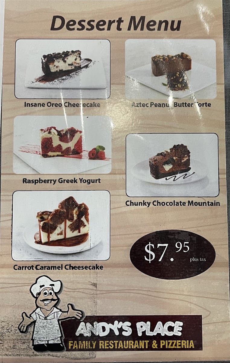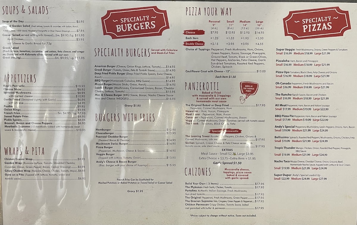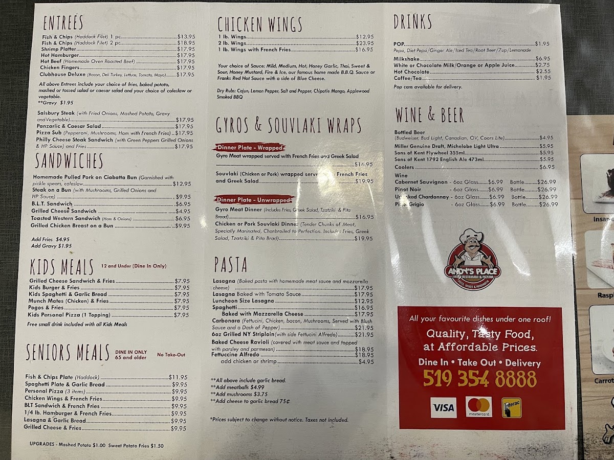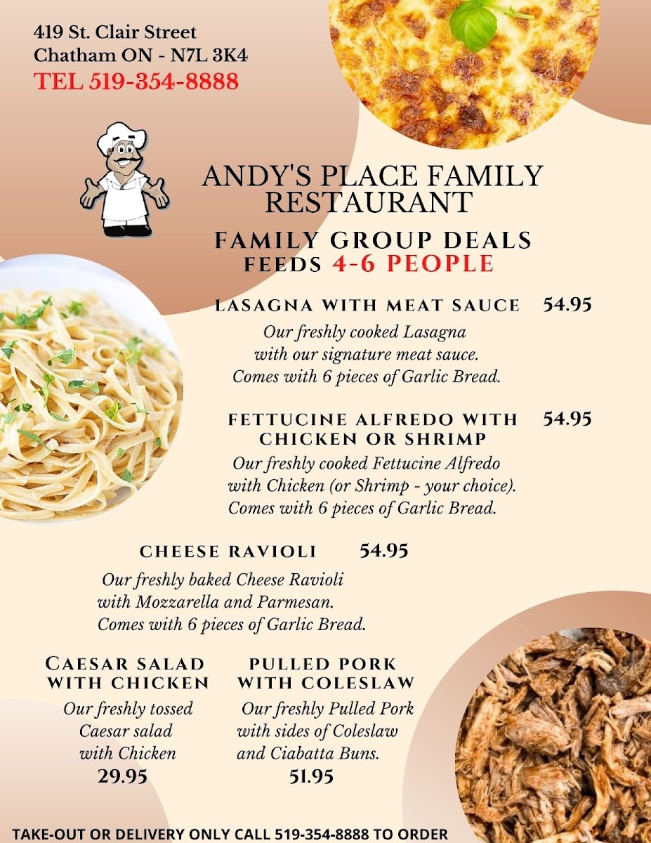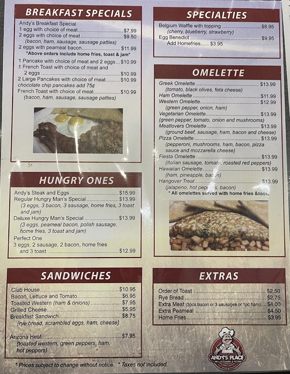 Welcome to Andy's Place, a beloved gem nestled in Chatham, Ontario. This cozy restaurant boasts a diverse menu that caters to various palates, offering everything from hearty brunch choices to delightful dinner options. Guests rave about their Greek omelet, Belgian waffles, and the must-try panzerotti, which have garnered praise for their delicious flavor and generous portions.